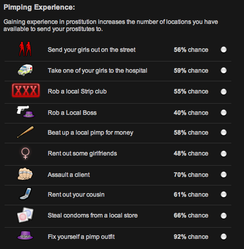 Once you have enough money you can enhance your prostitution business by purchasing a Brothel. A brothel allows you to manage more girls as well as giving you a steady income. Your brothel requires upgrades in order to reach the maximum potential of 50 prostitutes.